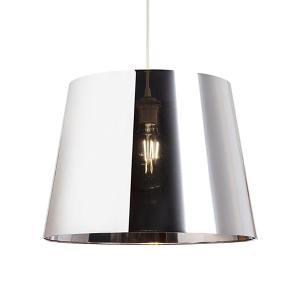 Abażur dekoracyjny z folii chromowanej, który można zawiesić lub umieścić na stojaku podłogowym. Abażur bez zapalonej żarówki ma lustrzany wygląd. Zapalona żarówka częściowo prześwituje. Odpowiednie akcesoria: HEX, ELISA, ENZO, LISA, KOMBIX, BEND, ALVIS, AMBITUS, NYC.