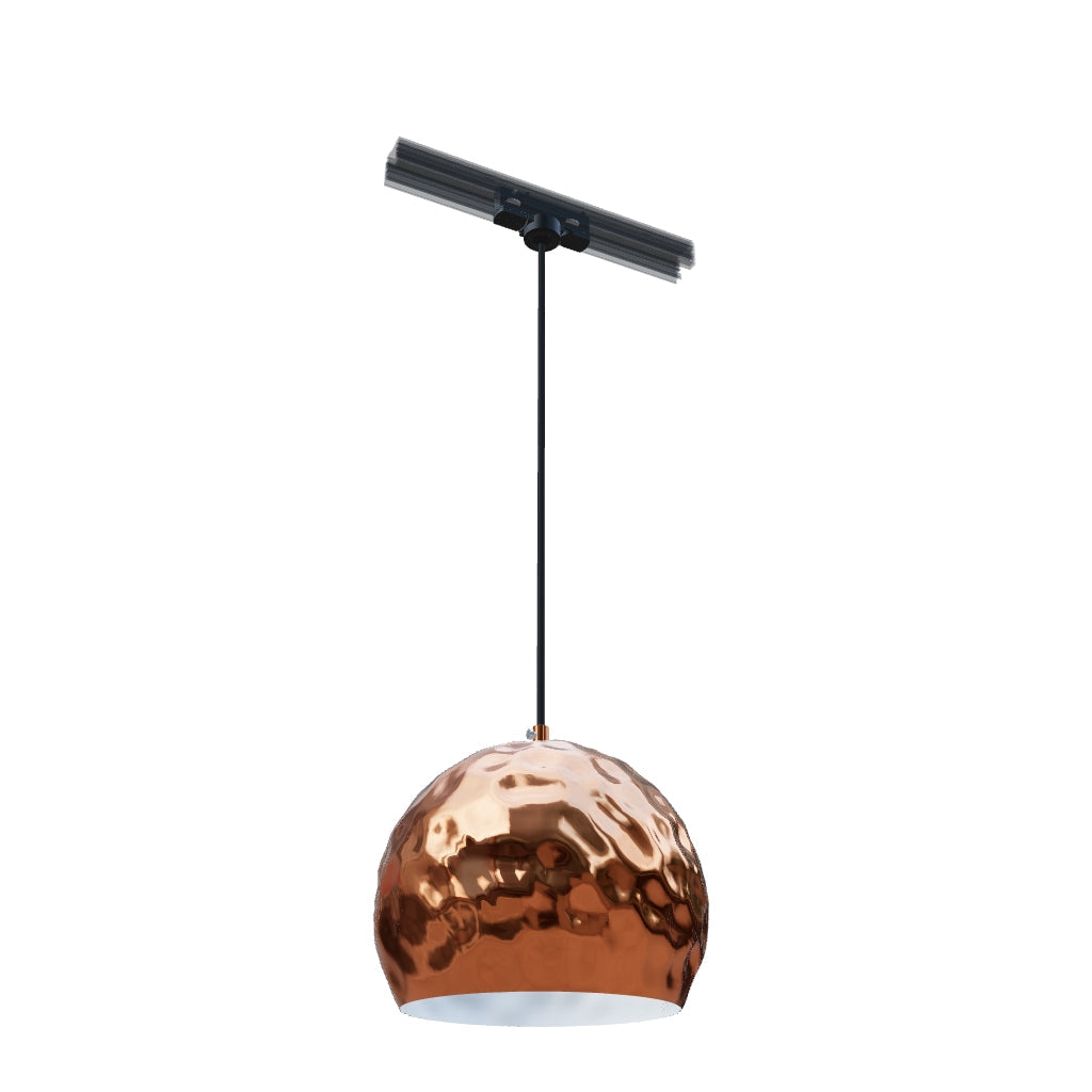 Lampa wisząca z metalowym kloszem. Zewnętrzna strona klosza jest miedziana, wewnętrzna strona jest lakierowana na biało. Kabel PCV czarny jest zakończony adapterem do szyny 3-fazowej.