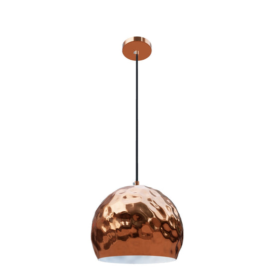 Lampa wisząca z metalowym kloszem. Zewnętrzna strona klosza jest miedziana, wewnętrzna strona jest lakierowana na biało. Dostarczana z czarnym kablem PVC i miedzianą rozetą.