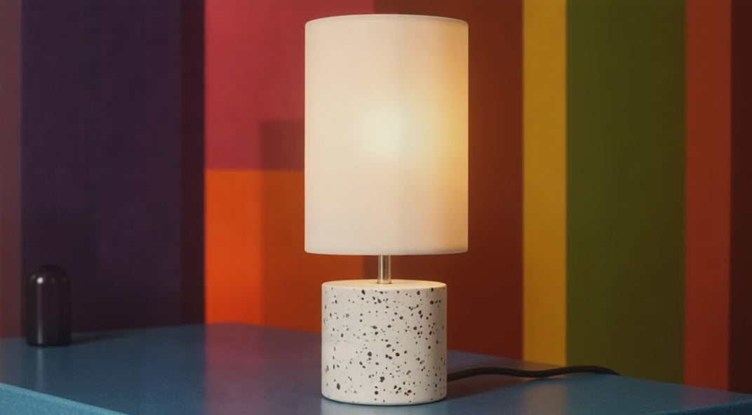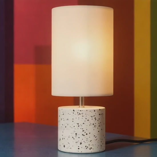 Lampa stołowa w stylu minimalistycznym o cylindrycznym kształcie z tekstylnym abażurem. Każda lampa ma oryginalny design.