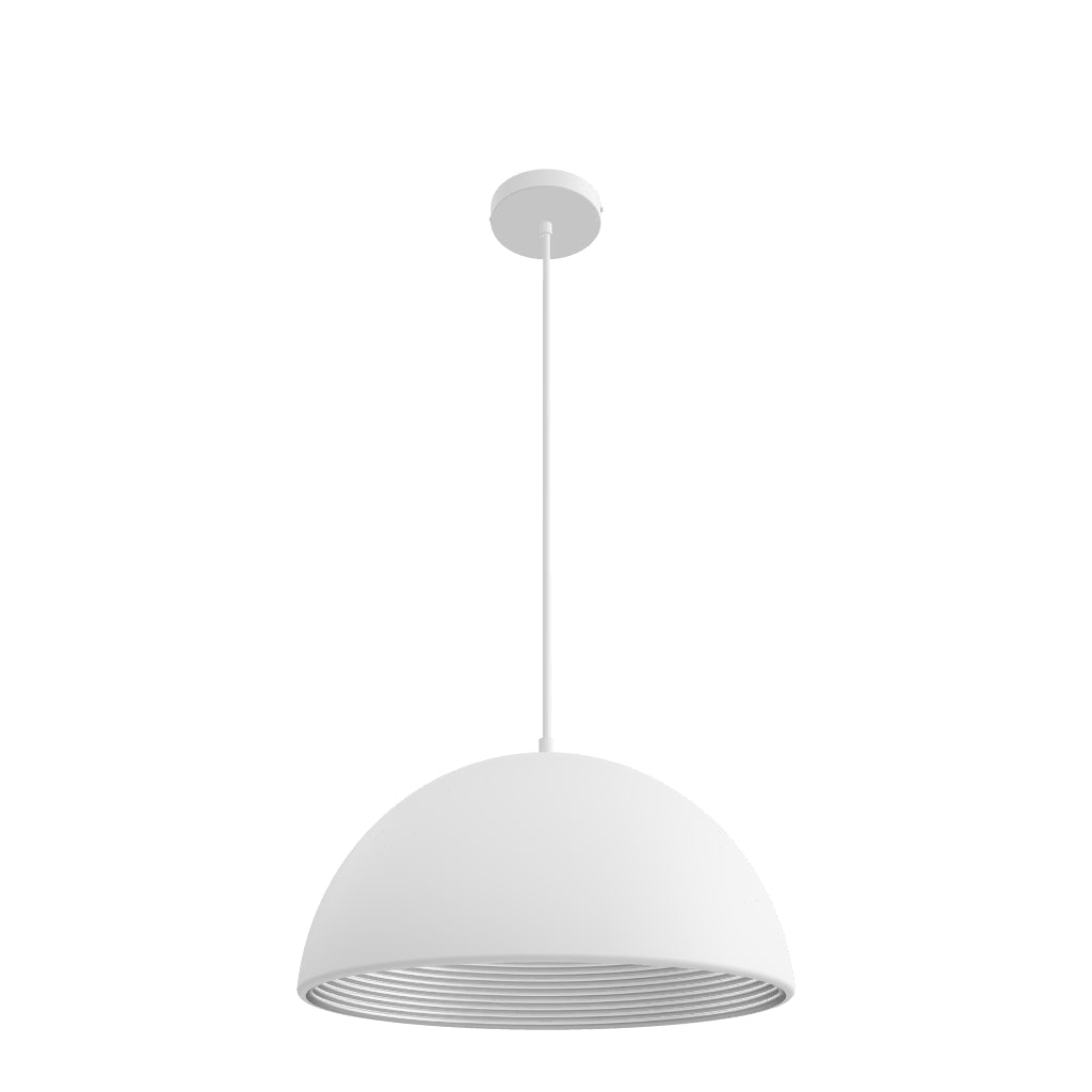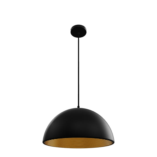 Lampa wisząca z kloszem metalowym lakierowanym na czarno. Wewnętrzna strona klosza jest w kolorze złotym.