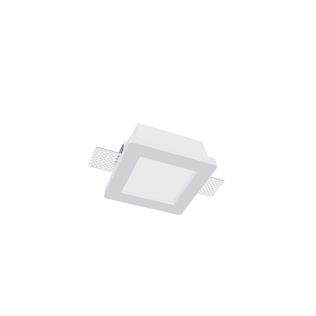 Lampa wpuszczana gipsowa kwadratowa bez ramki na żarówki z gwintem GU10 i dyfuzorem ze szkła satynowego. Lampa jest przeznaczona do montażu w suficie g-k.
