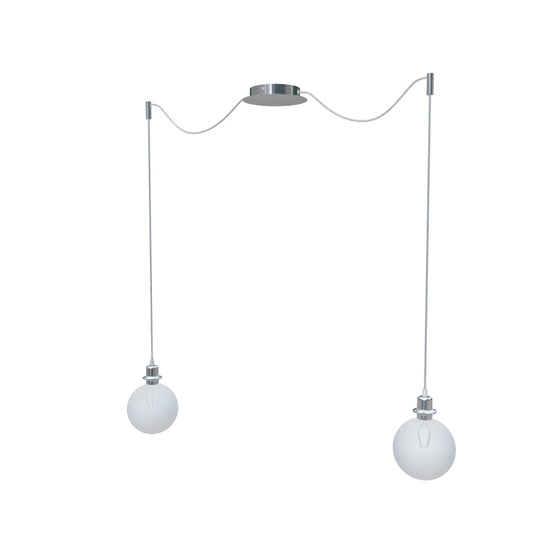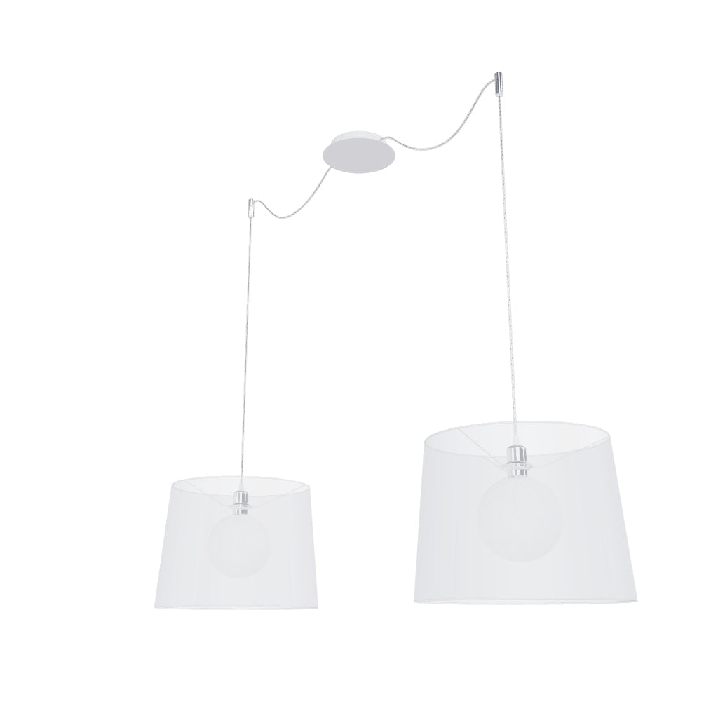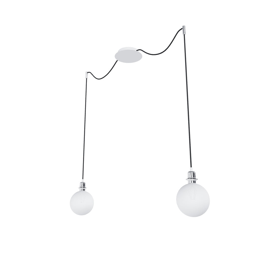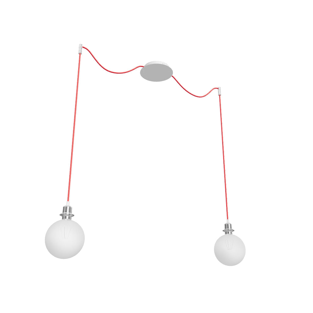 Zestaw wiszący z centralną sufitową podstawą, z której wychodzą dwa tekstylne kable z metalową oprawką E27 mocowane odzielnie obok podstawy. Kable posiadają chromowe uchwyty pozwalające na umieszczenie ich na suficie w dowolnej odlegości od podstawy. Długość kabli 3 m. Polecane akcesoria: ARISTA, DELI, JAKARANDA, DOUBLE 40/30, DOUBLE 55/30, ASPRO 40/30, ASPRO 55/30, RON 15/20, RON 40/25, RON 55/30, TEMPO 15/30, TEMPO 30/19.
