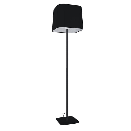 Lampa podłogowa z kwadratowym tekstylnym abażurem i metalowym stojakiem.