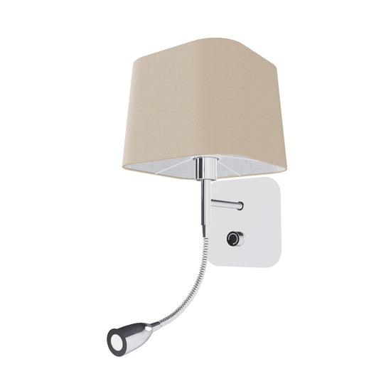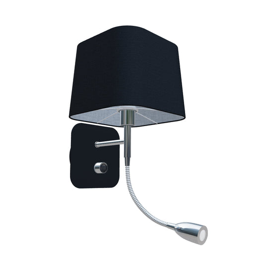 Lampa ścienna z kwadratowym tekstylnym abażurem i elastycznym ramieniem zakończonym reflektorem LED. Lampa posiada dwa źródła światła, którymi można sterować oddzielnie za pomocą przełącznika obrotowego umieszczonego na kwadratowej podstawie oprawy.