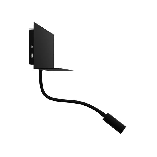 Lampa ścienna LED z półką na telefon oraz ze zintegrowanym portem USB. Reflektor LED na elastycznym ramieniu i oświetlenie pośrednie są sterowane oddzielnie za pomocą dwóch przełączników.
