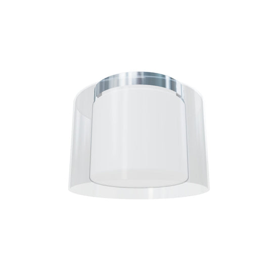 Lampa sufitowa z kloszem wewnętrznym opalowym i zewnętrznym przezroczystym na chromowanej podstawie na żarówli LED z gwintem E27. Właściwa do montażu w środowisku o podwyższonej wilgotności.