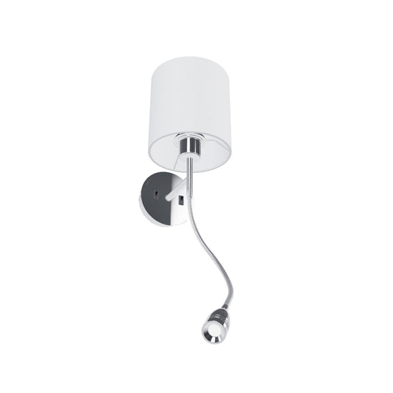 Lampa ścienna z tekstylnym abażurem i reflektorem LED na elastycznym ramieniu. Lampa posiada dwa źródła świała, które można włączać i wyłączać niezależnie od siebie za pomocą wyłącznika na podstawie.