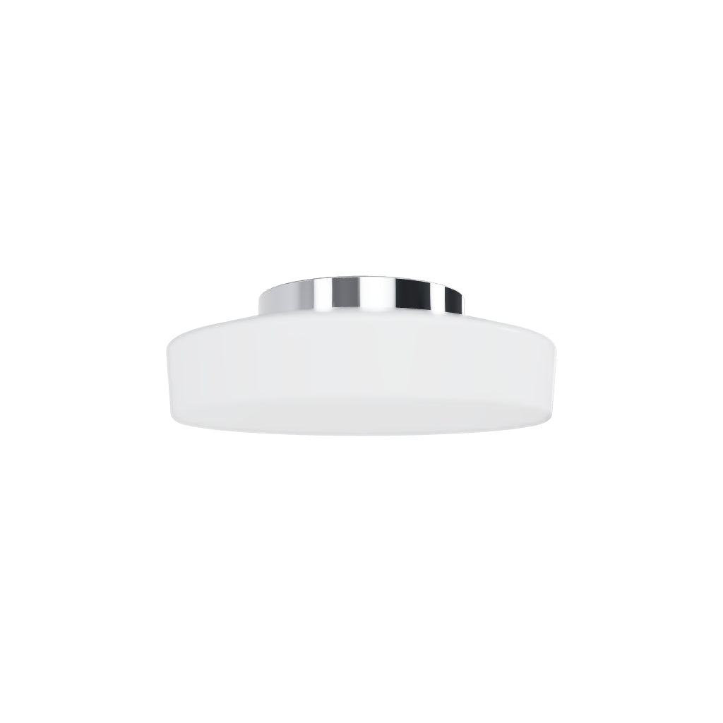 Lampa LED sufitowa z opalowym kloszem na chromowanej podstawie. Właściwa do montażu w środowisku o podwyższonej wilgotności.